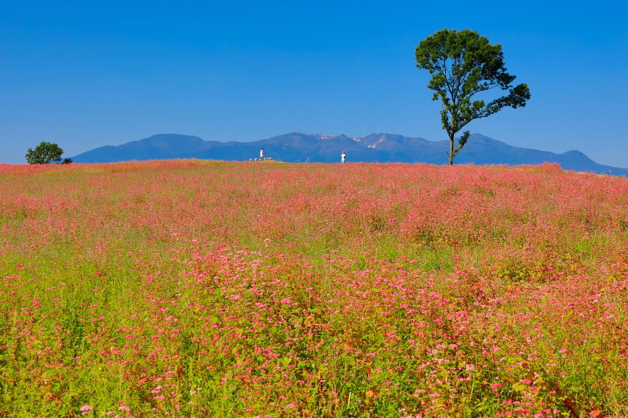 10月に下川崎のとうぎた地区のあかそば畑は赤く色づき見頃になり、晴れた日は安達太良連峰も見渡せて、こんなところもあったのかと思う景観がオススメ