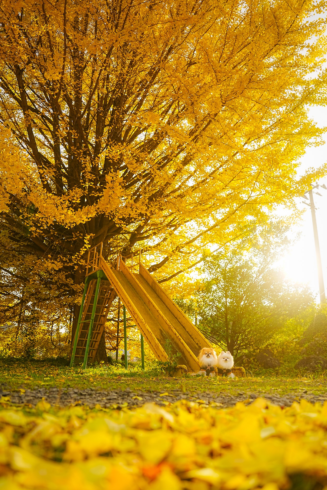 閉校になった小学校の校庭に佇む銀杏の木と錆付いたすべり台。色づいた銀杏の黄色とすべり台の黄色が相まり、どこか懐かしい子どもの頃に遊んだような風景に心が癒やされました。